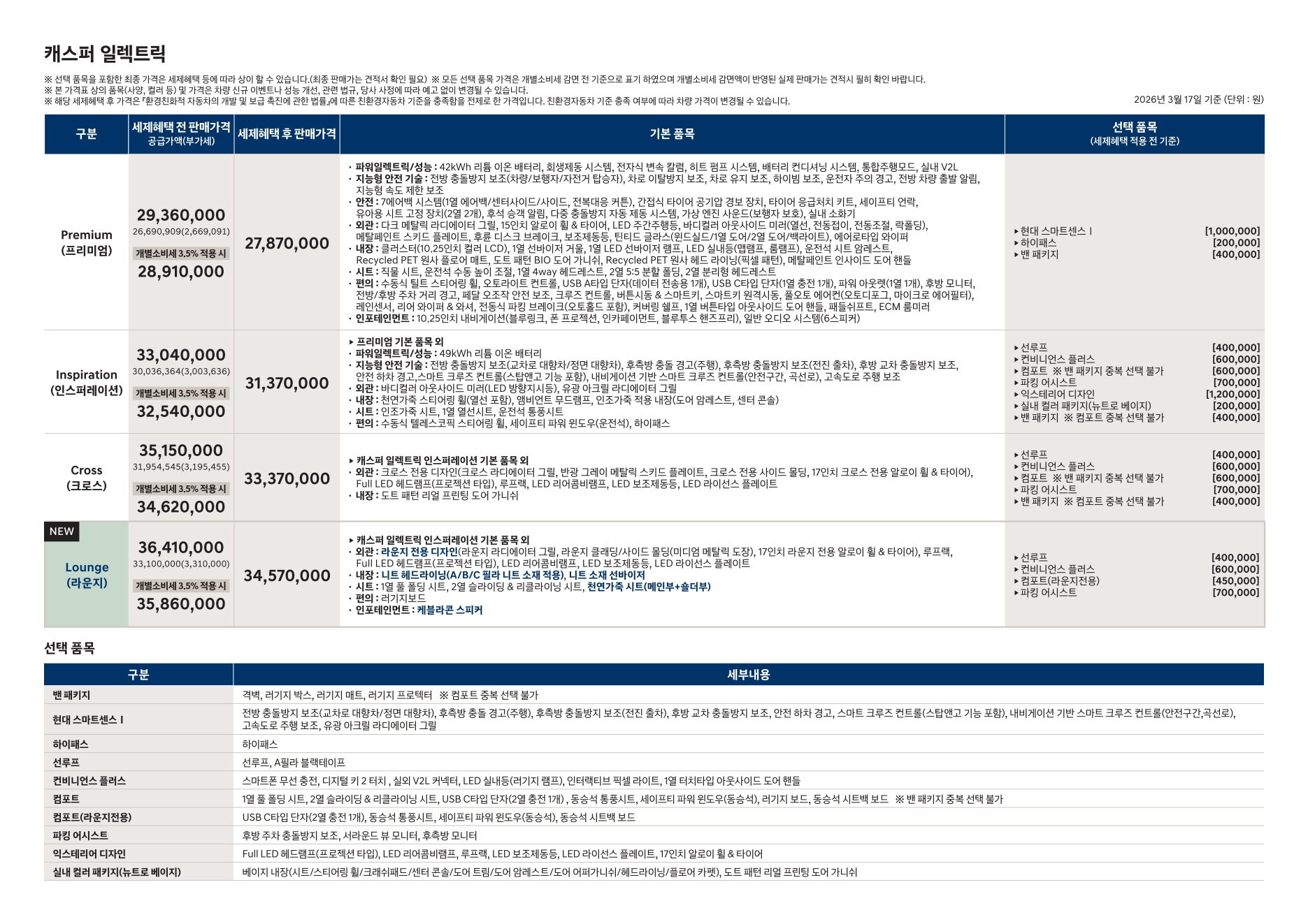 2026년 3월 캐스퍼 일렉트릭 신차가격표 (라운지 트림 신설)